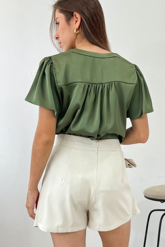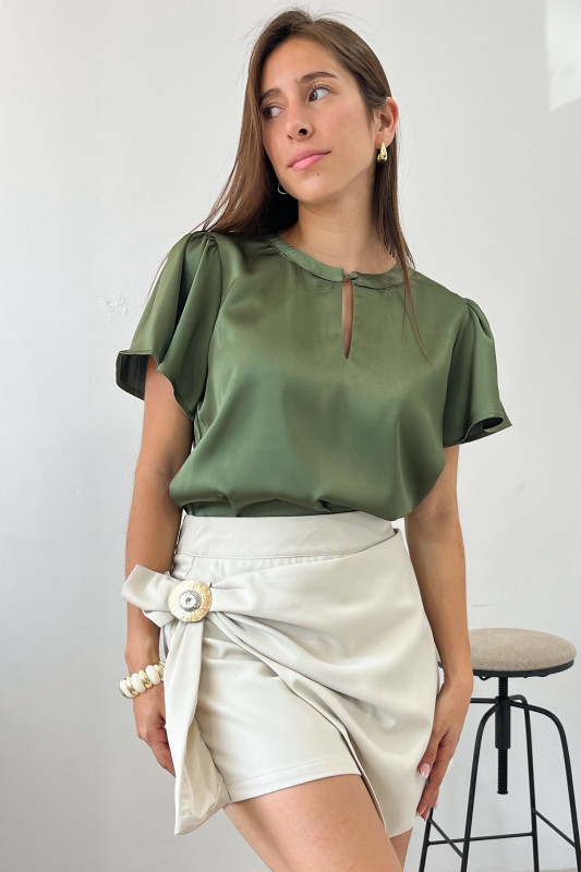 Blusa corte relajado en tela satinada; mangas amplias y botón en cuello.