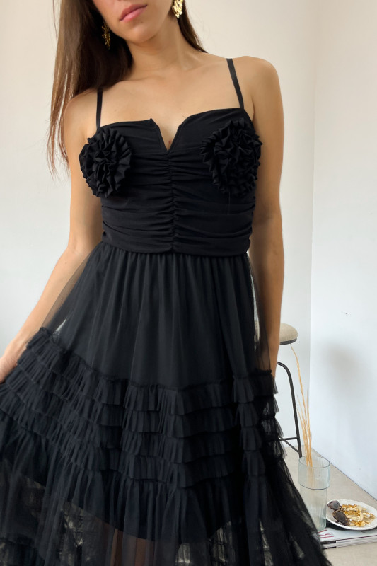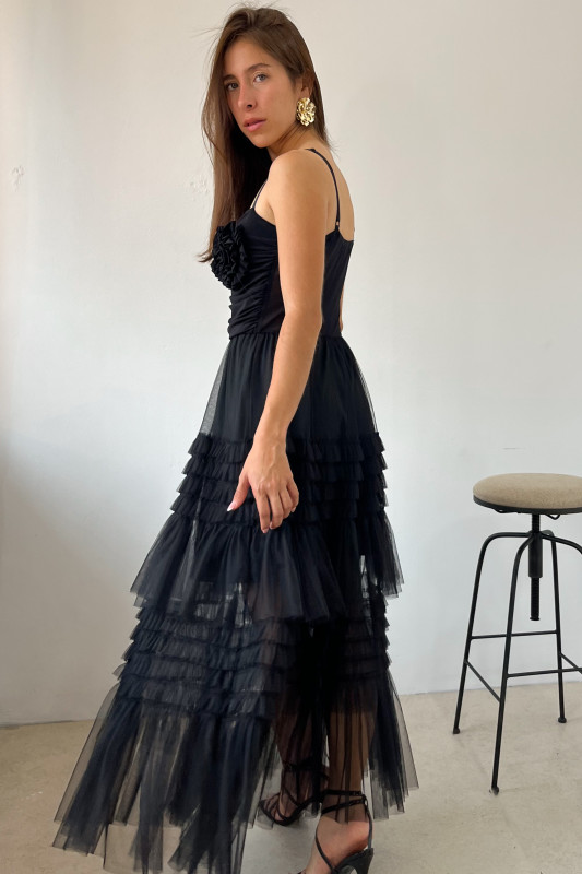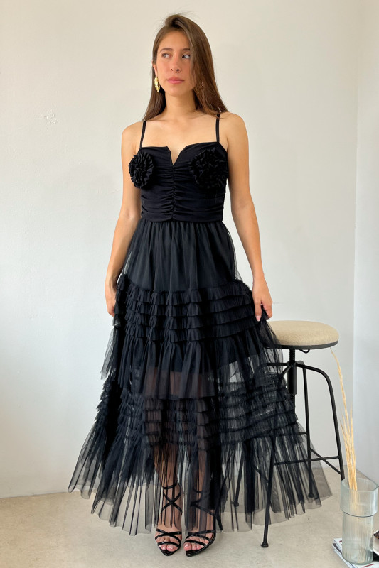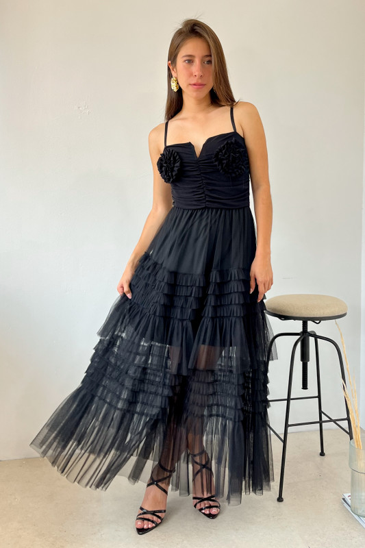 Vestido largo midi en tull ligero, parte alta corte semiajustado, espalda con transparencia y flores resaltadas al frente; parte baja en falda corte ligero con transparencias y pastelones en diferentes niveles.