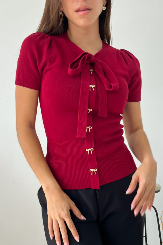 Blusa corte semiajustado en tejido de punto fino con lazo ajustable al frente y botones de remaches metálicos.