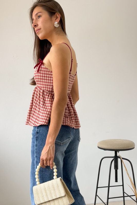Blusa corta en tela ligera con estampado de cuadros, corte ajustado en busto con elástico drappeado en espalda y amplia en parte baja; tirantes ajustables con lazos al frente en terciopelo.