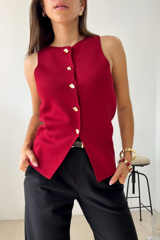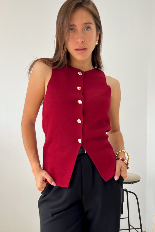 Chaleco en tejido de punto fino en corte semiajustado con botones dorados al frente.