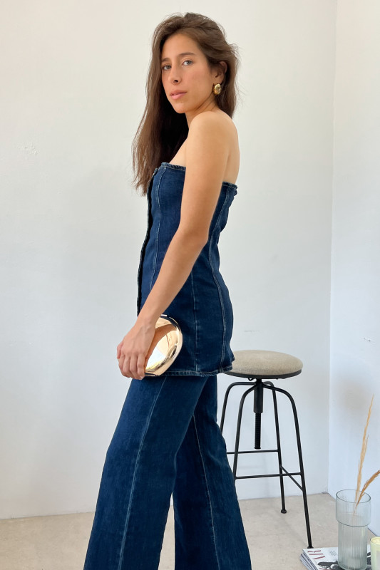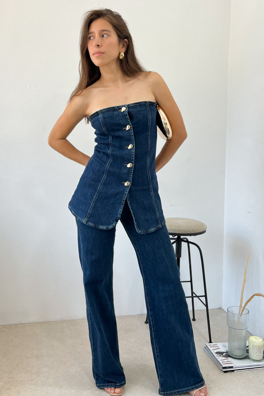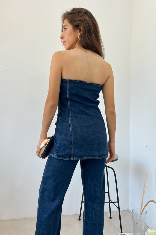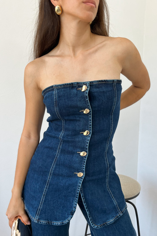 Blusa tipo corset strapple en mezclilla oscura strech con pinzas, botones irregulares y silicón antiderrapante en interior del busto.