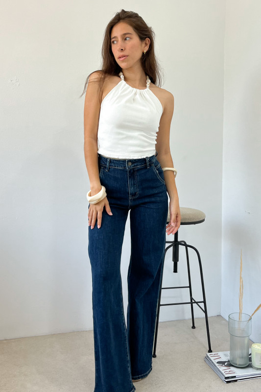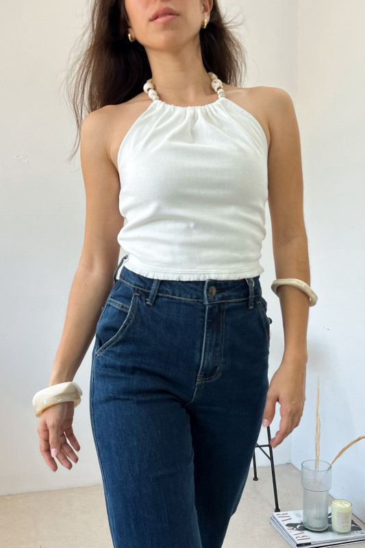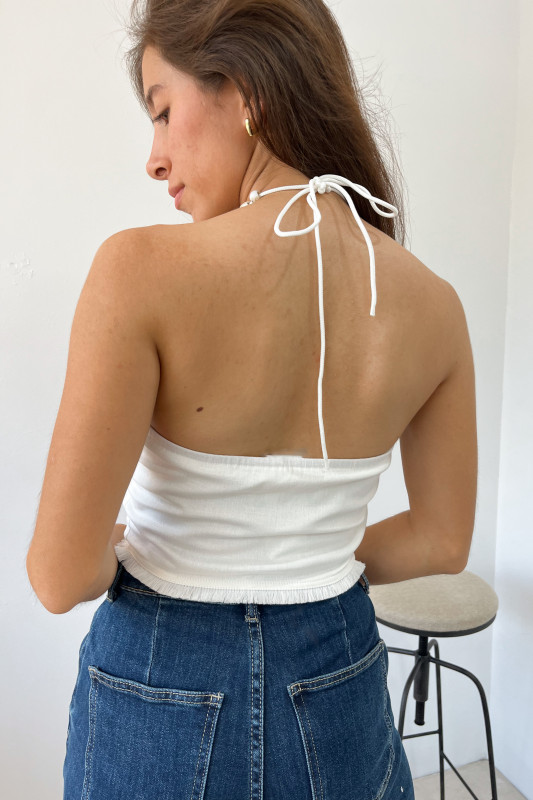 Blusa corta semiajustada con cuello haltter ajustable con aplicaciones de cuentas en lazo ajustable; cierre lateral y acabado deshilachado en parte baja.