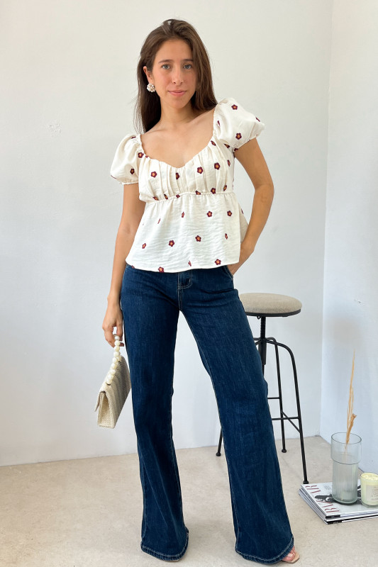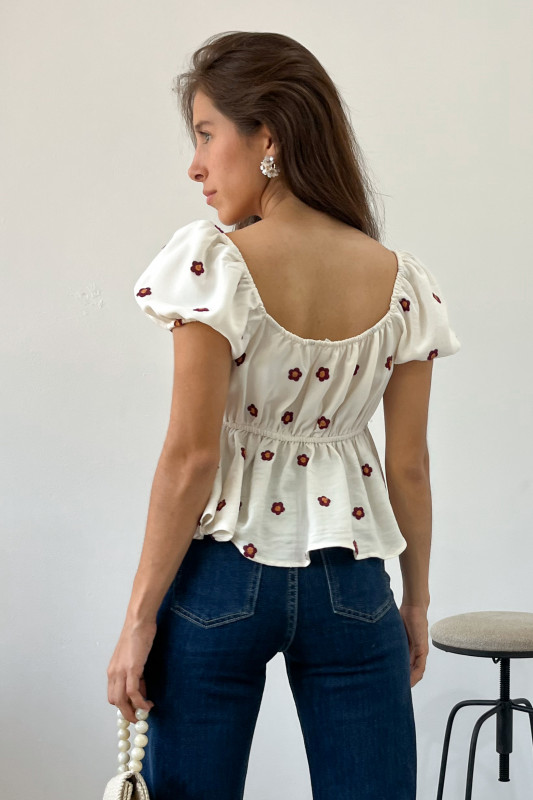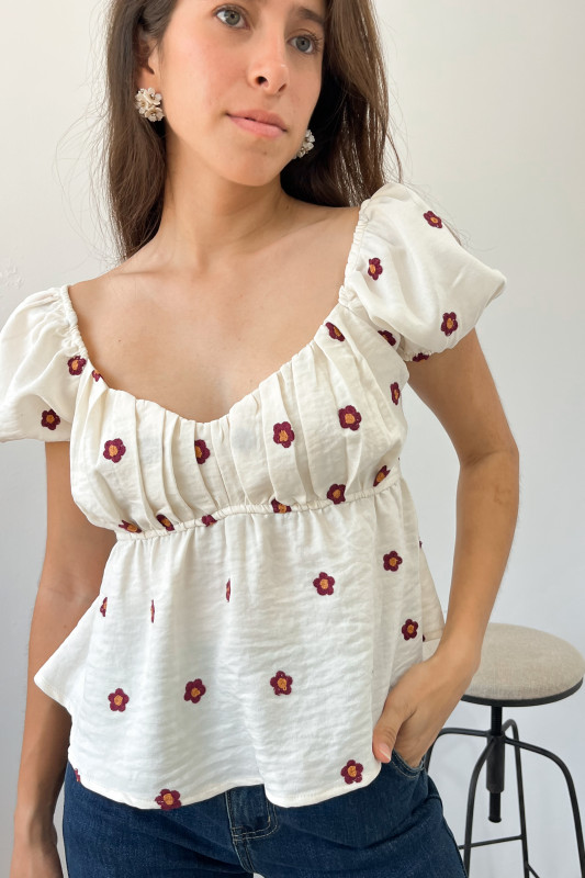 Blusa corta con margaritas bordadas en contraste, escote corazón y alforzas en busto, mangas abullondas con elástico en cintura y espalda.
