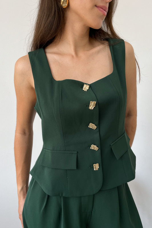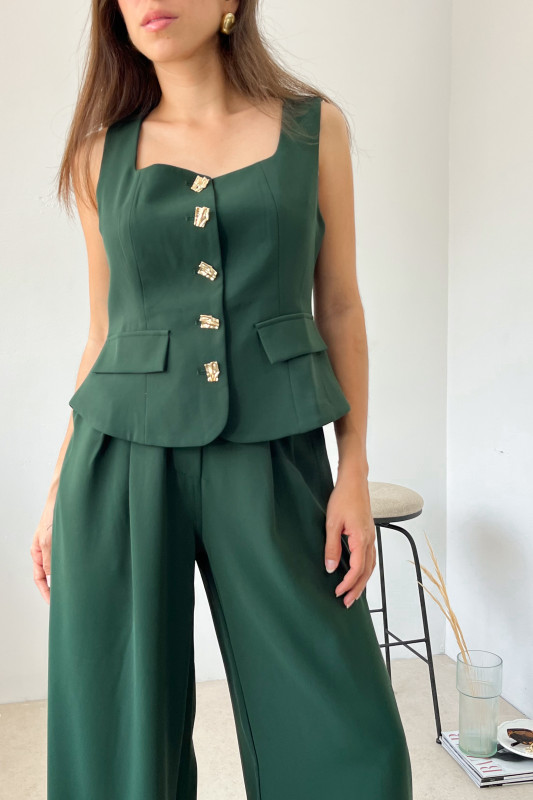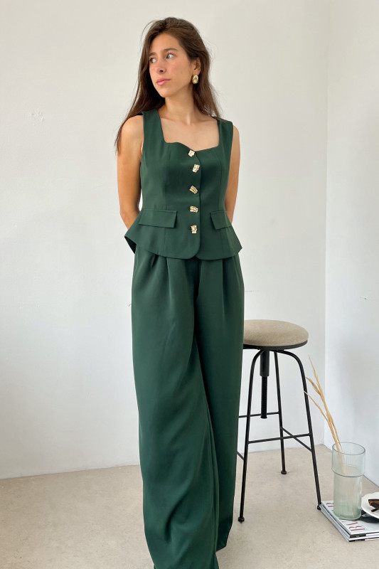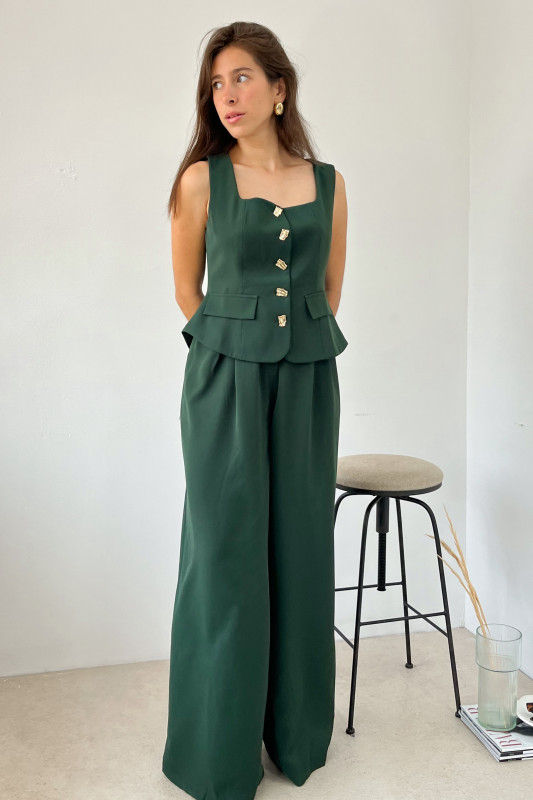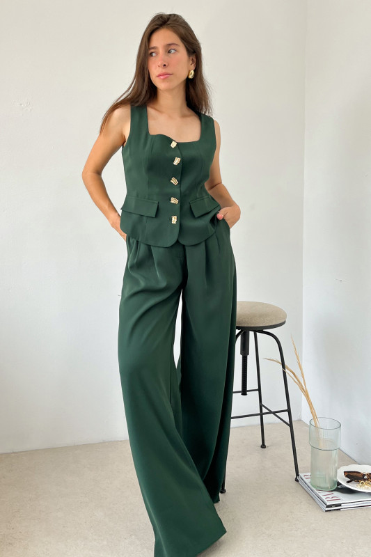 Set en dos piezas; chaleco en corte semi ajustado con ligero corte peplump,tirantes anchos y botones irregulares al frent; maxi pantalón piernas anchas con pinzas al frente, pretina definida y bolsas laterales.