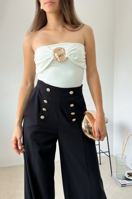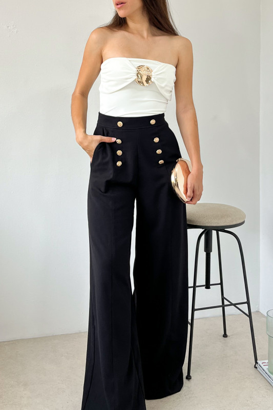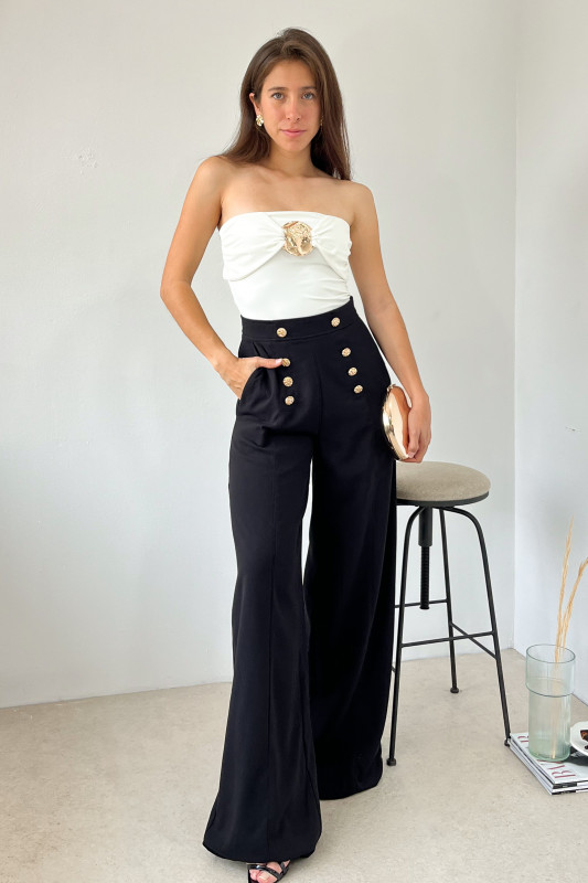 Maxi pantalón en tela semirigida; tiro alto, bolsas laterales, aplicaciones de botones dorados al frente y simulación de bolsillos en espalda.