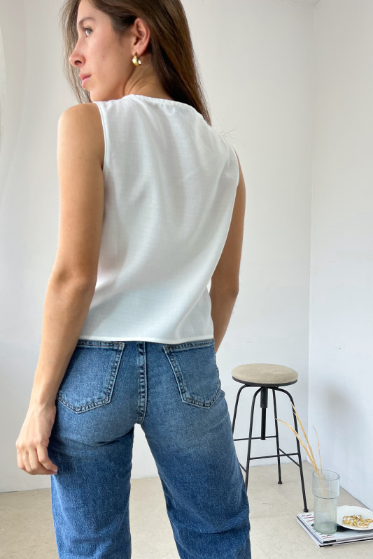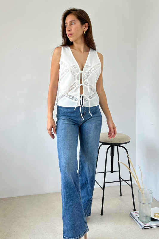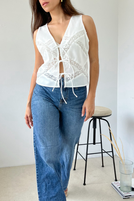 Chaleco corte relajado con detalles de deshilados y lazos ajustables al frente.