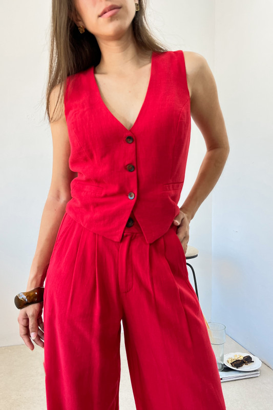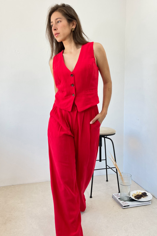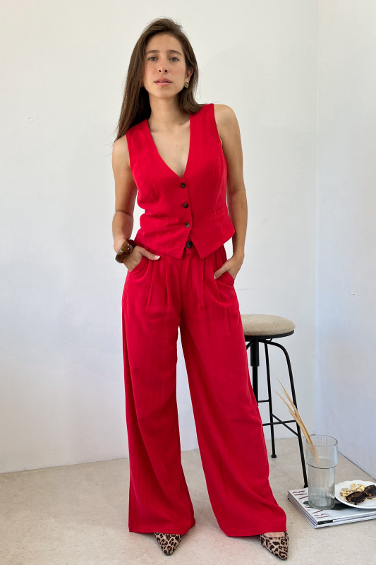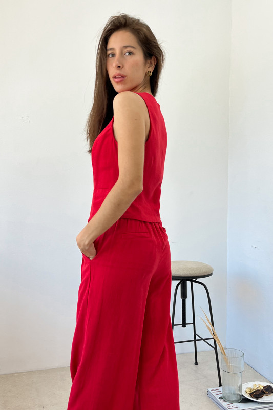 Set en dos piezas en tela ligera; chaleco corto en corte recto; pantalón tiro alto con piernas anchas, pinzas al frente, bolsas laterales y elástico en espalda.