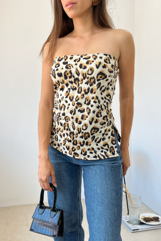 Top strapple en tela strech con estampado felino; corte semi ajustado con aperturas en parte baja.