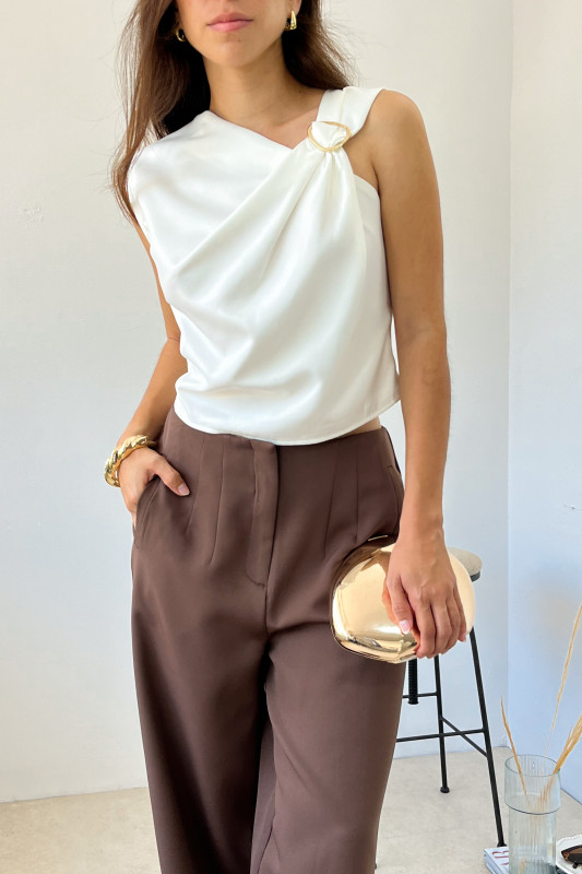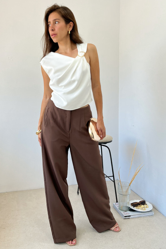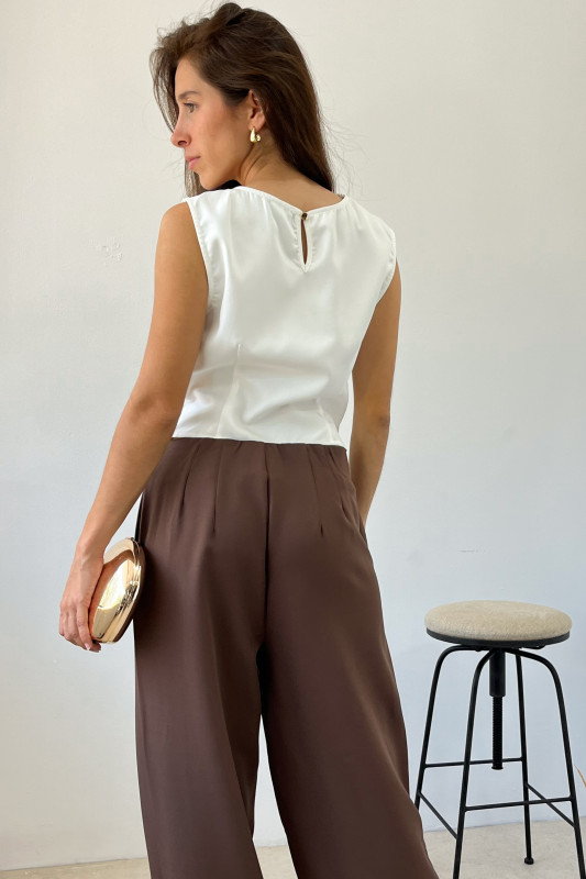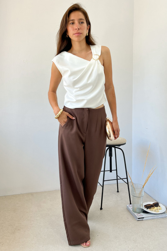 Pantalón recto de tiro medio, con pinzas al frente, bolsas laterales y elástico oculto con pinzas en espalda.