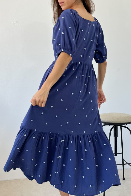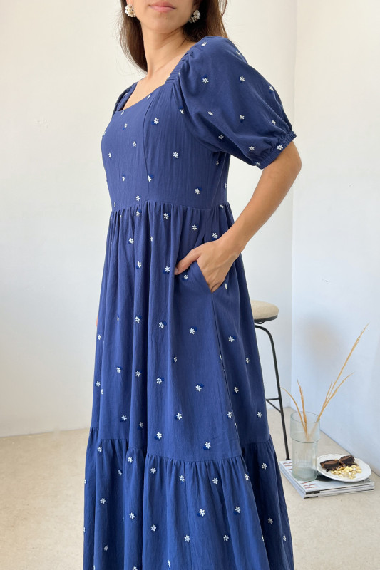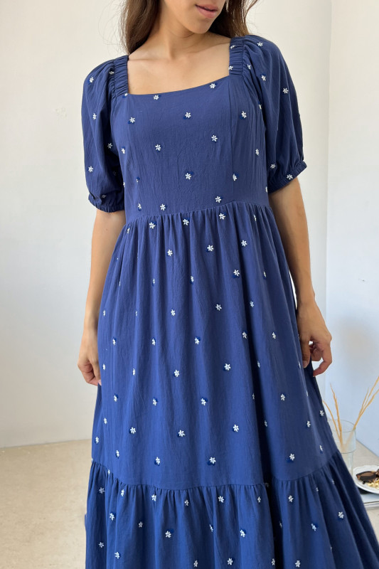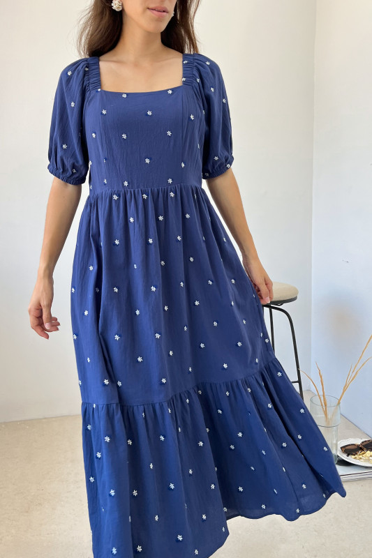 Maxi vestido en tela ligera con bordados florales en contraste; escotes cuadrados con elásticos, mangas abullonadas y cierre en espalda.