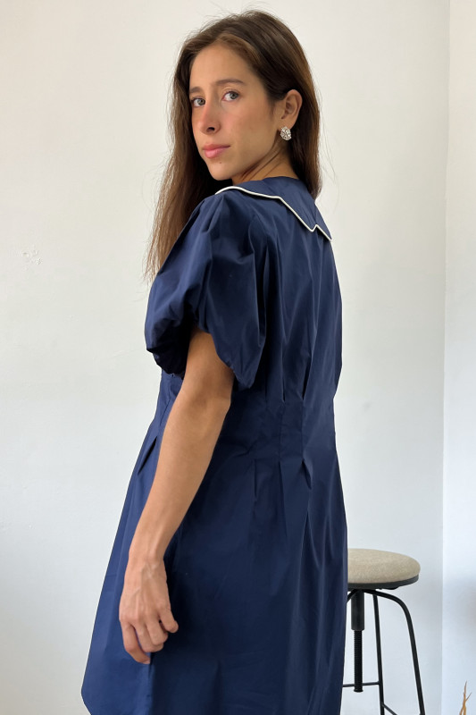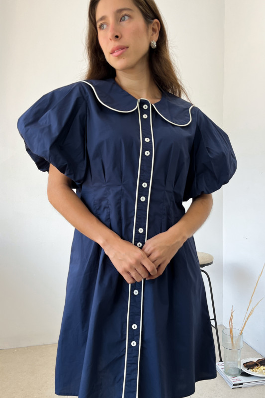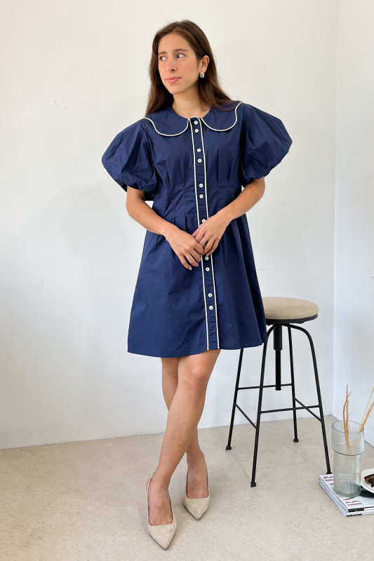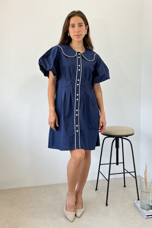 Vestido corto en popelina de algodón con bastillas y botones en contraste; cuello tipo  Peter Pan, mangas globo y pinzas semiajustadas en cintura.