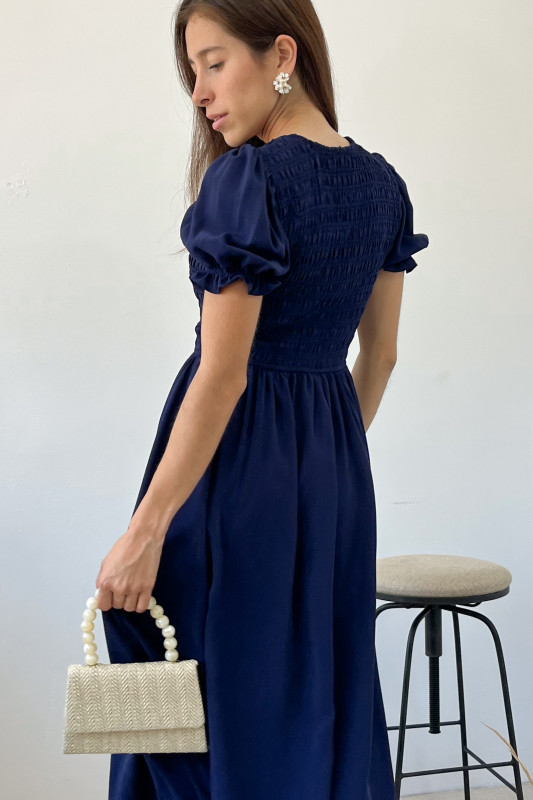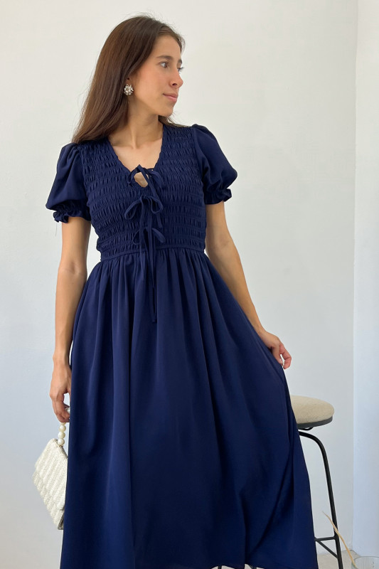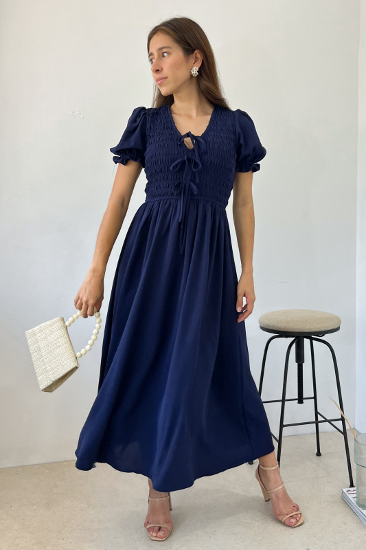 Maxi vestido en tela ligera, parte alta con elástico drappeado, lazos ajustables en escote y mangas abullonadas con olanes cortos.