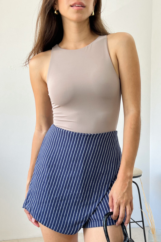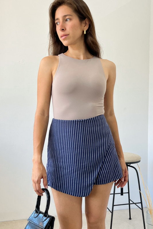 Short falda en tela ligera en contraste marino con líneas blancas; faldon asimetrico al frente y cierr en espalda.