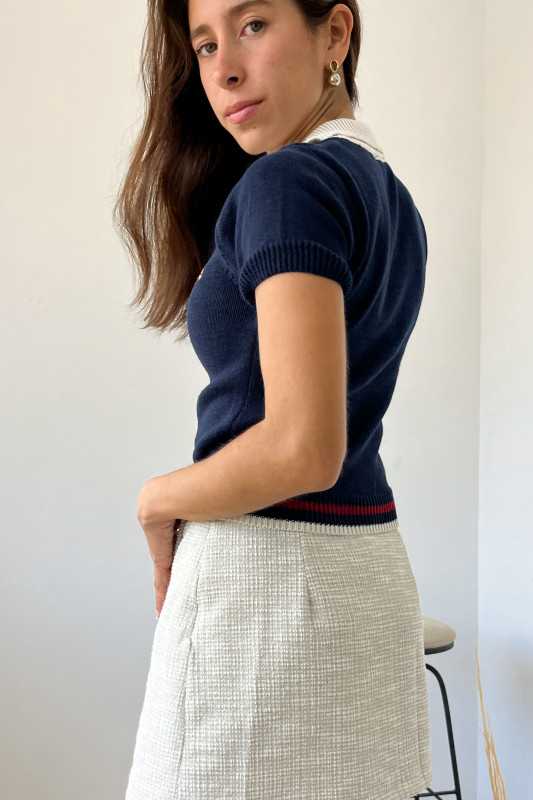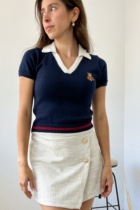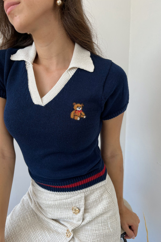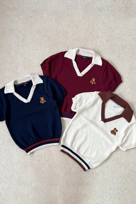 Blusa corta tipo polo en tejido de punto con aplicación de osito bordado, cuello en contraste y cintura con franjas de colores.