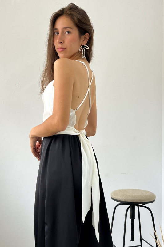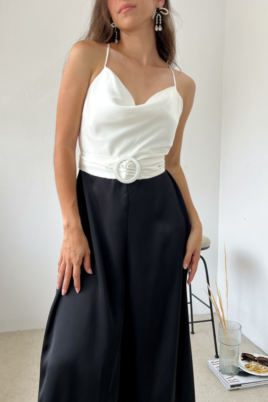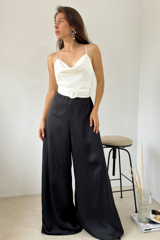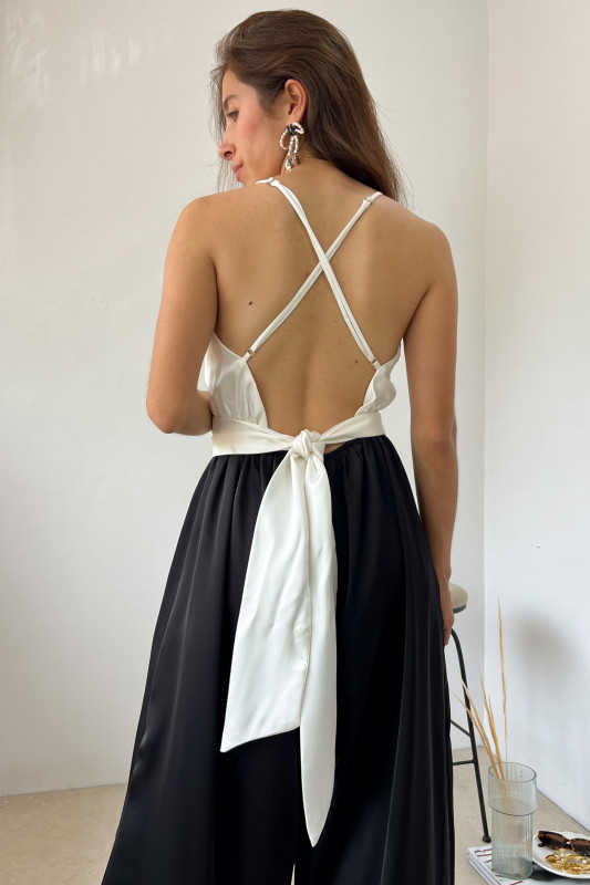 Palazzo en tela satinada en contraste negro con blanco, parte alta con escote lencero, espalda escotada con tirantes cruzados ajustables y lazo ancho envolvente en cintura con hebilla y ajustable en espalda baja; maxi pantalón con piernas anchas y elástico oculto en espalda.