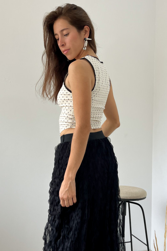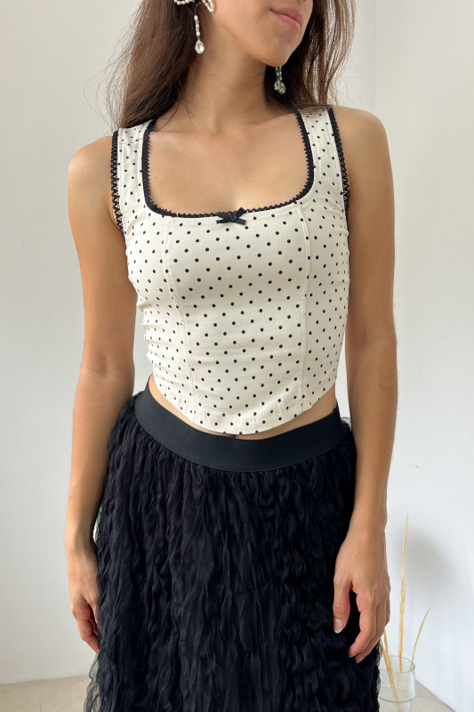Blusa corta en tela strech con estampado de lunares en contraste con escote amplio, tirantes anchos y detalles de encaje.