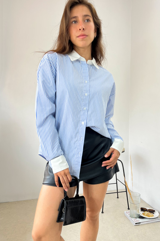 Short falda corto en vinilpiel con faldon cruzado al frente y cierre lateral.