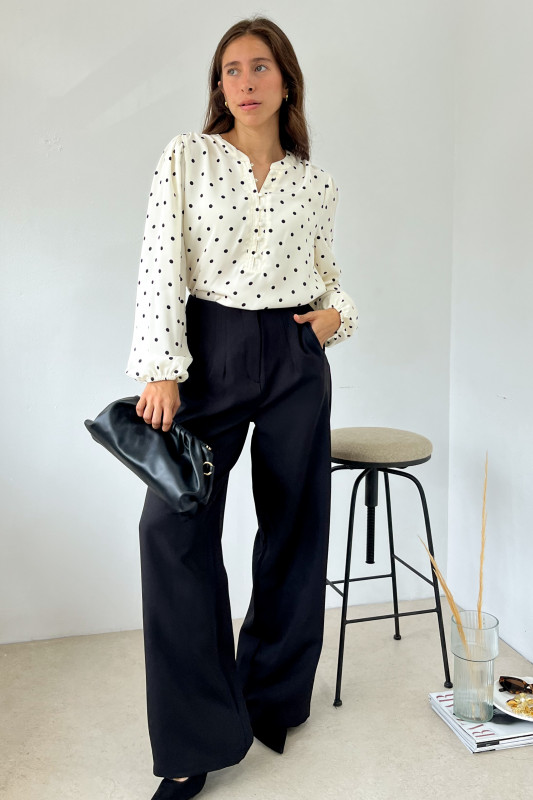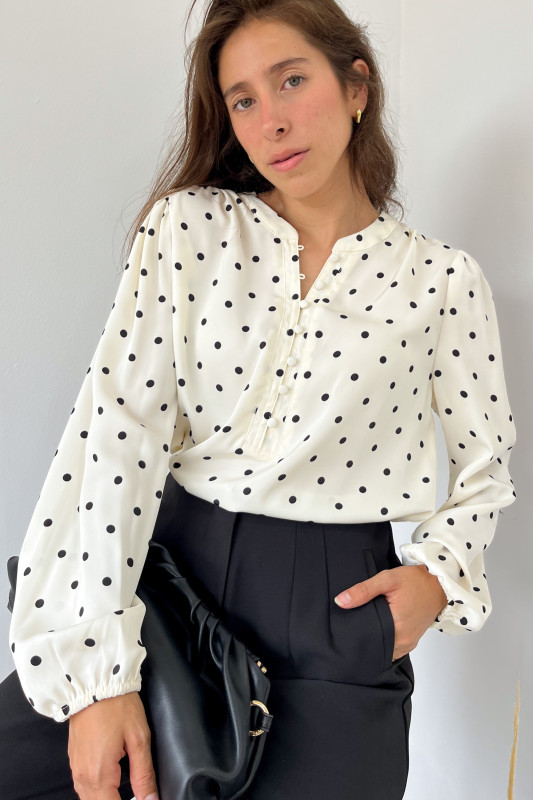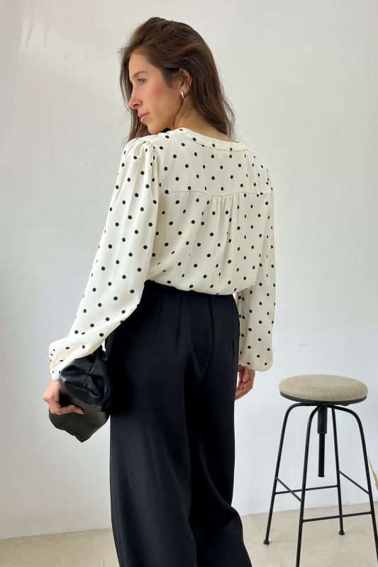 Blusa formal en corte relajado; tela ligera con estampado de lunares en contraste; aplicaciones de botones forrados en misma tela y mangas anchas con elástico en puños.