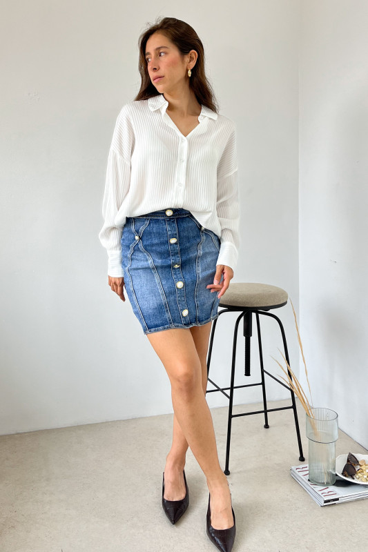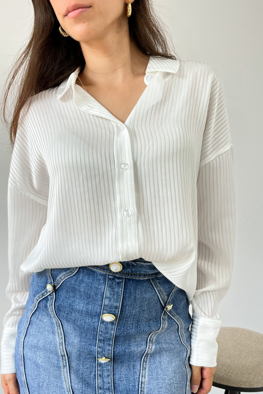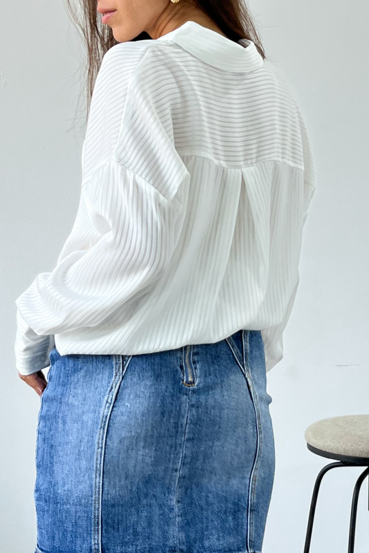 Camisera en corte relajado con mangas fluidas en tela con ligeras líneas con transparencia.