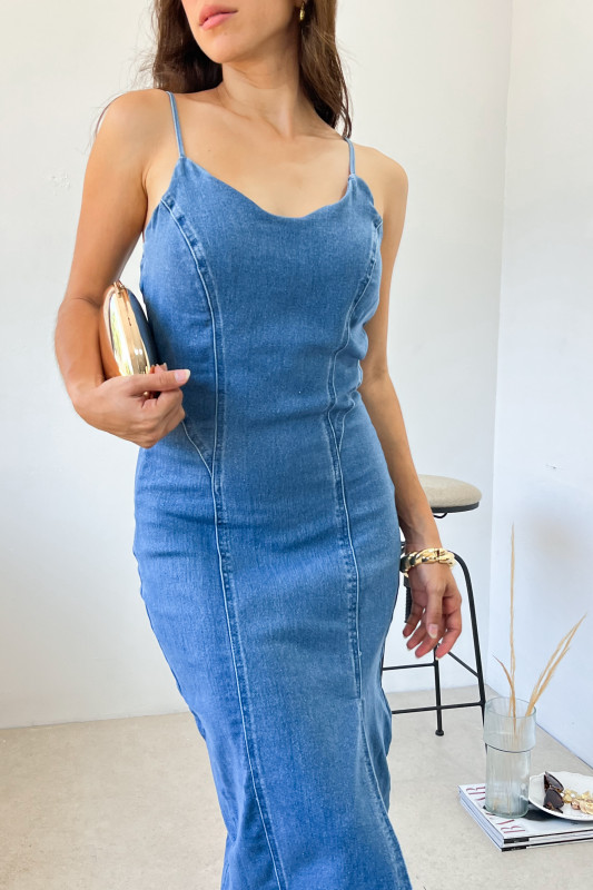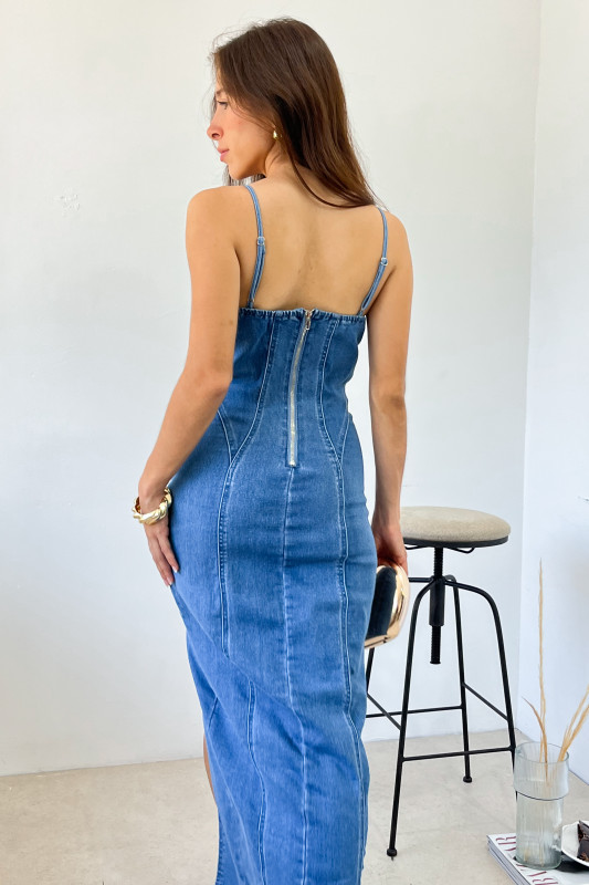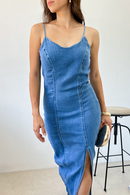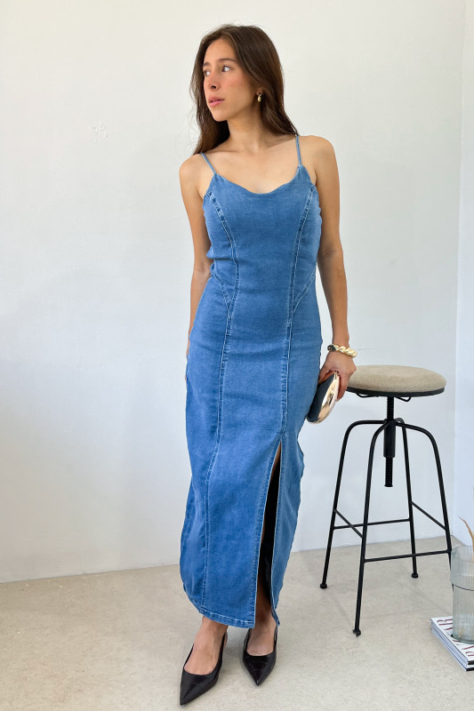 Vestido largo en mezclilla strech tono claro, tirantes ajustables, pinzas en cintura, cierre en espalda y apertura alta al frente.