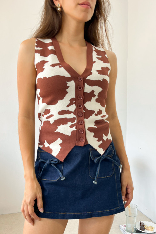 Chaleco en tejido de punto fino cow print;  botones al frente y bastillas en contraste.