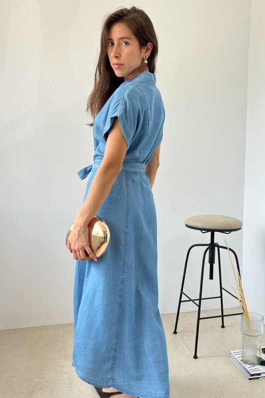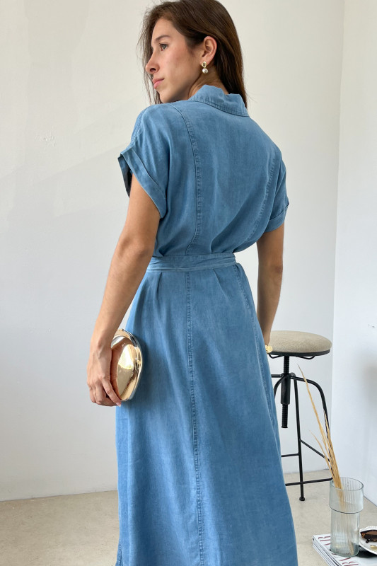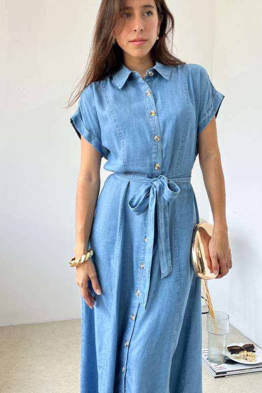 Vestido largo en mezclilla ligera, corte camisero con pinzas y botones al frente; mangas fluidas y cintillo ajustable en misma tela.