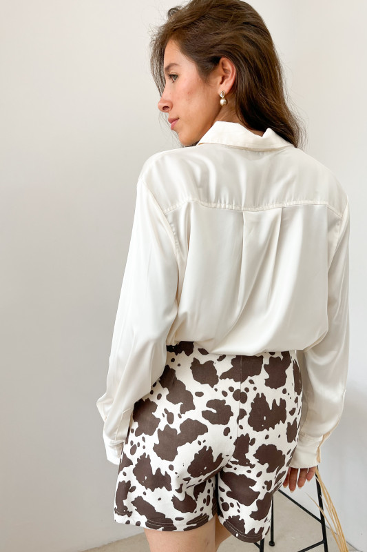 Camisera en corte relajado en tela fluida con acabado satén; botones al frente y puños anchos.