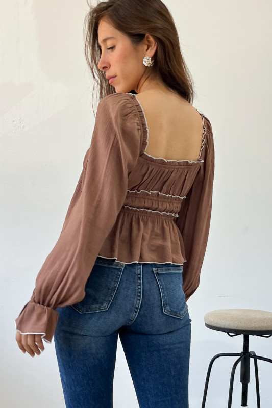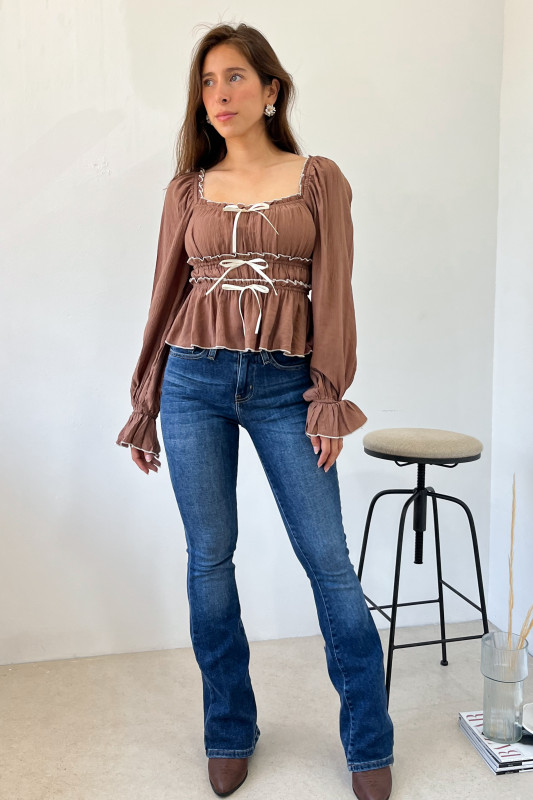 Blusa boho en tela ligera con aplicaciones de contraste en bastillas y lazos al frente; escote cuadrado con elásticos en busto, cintura, puños y mangas amplias.