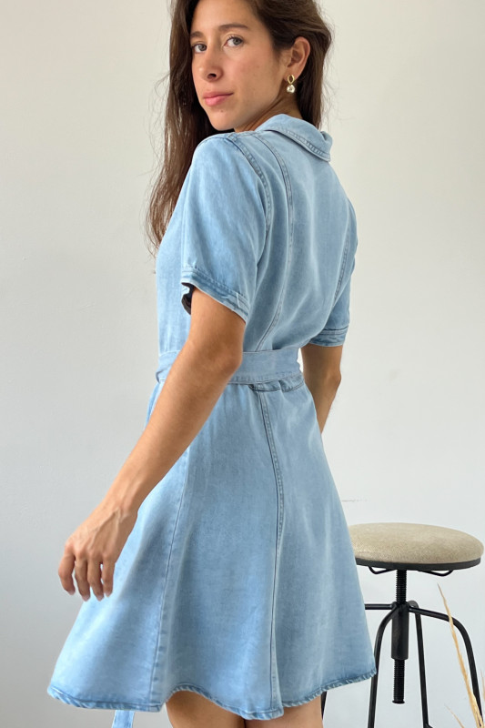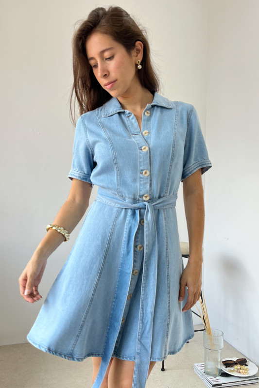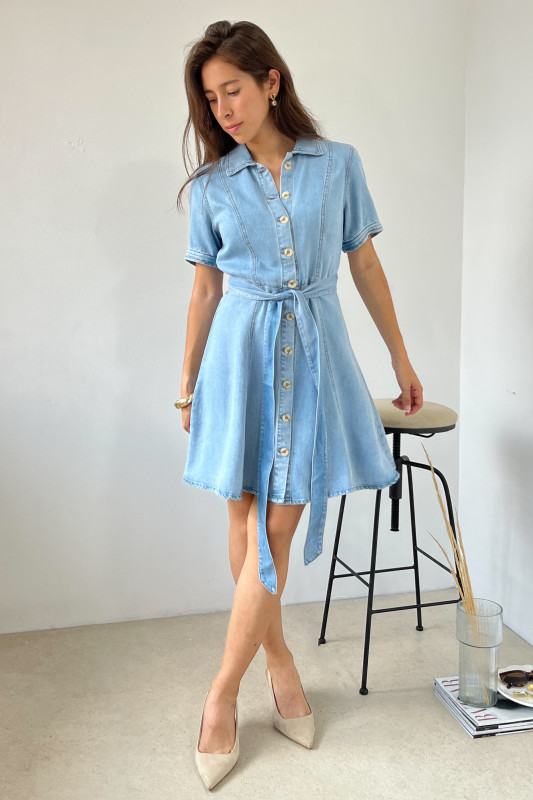 Vestido corto en mezclilla clara de grosor medio; botones en contraste y cintillo ajustable en misma tela.