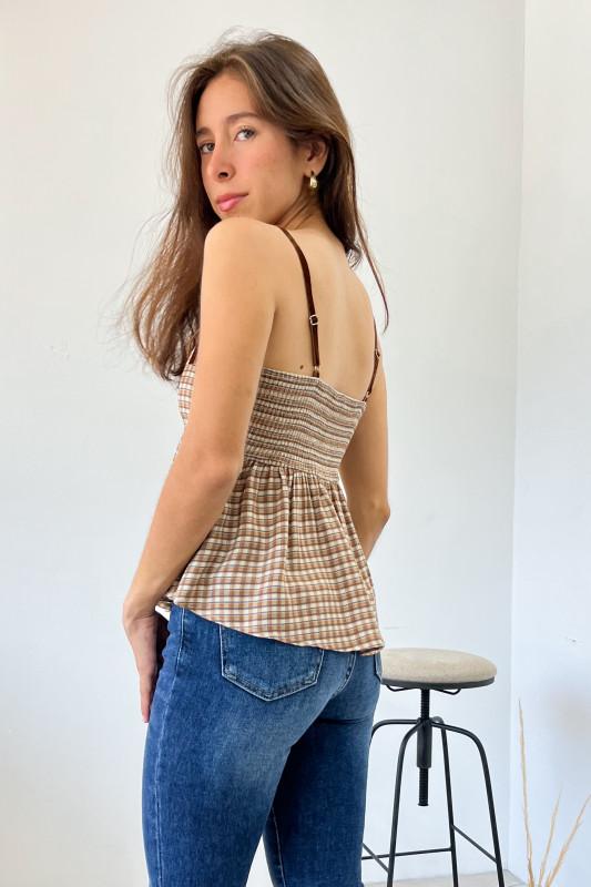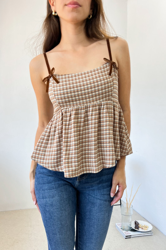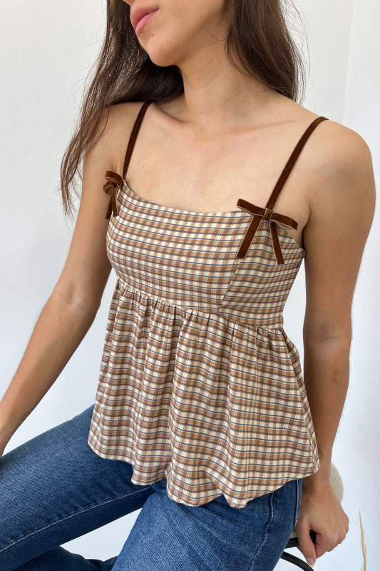 Blusa corta en tela ligera con estampado de cuadros, corte ajustado en busto con elástico drappeado en espalda y amplia en parte baja; tirantes ajustables con lazos al frente en terciopelo.
