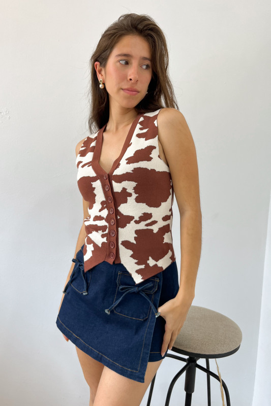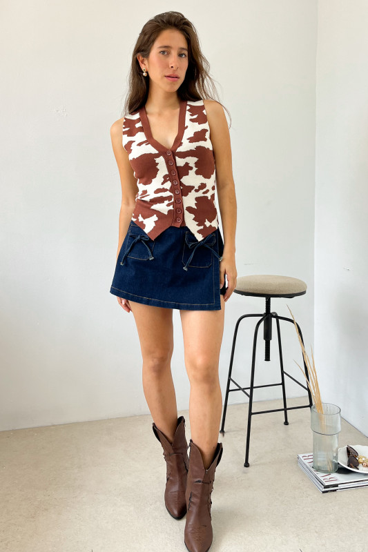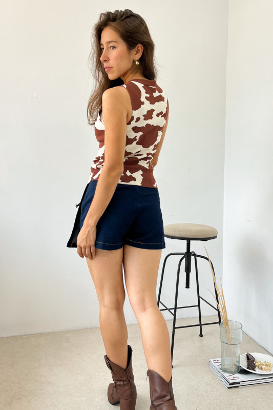 Short falda corto en mezclilla strech tono oscuro; falso faldón asimétrico con bolsas al frente y moños y cierre lateral.