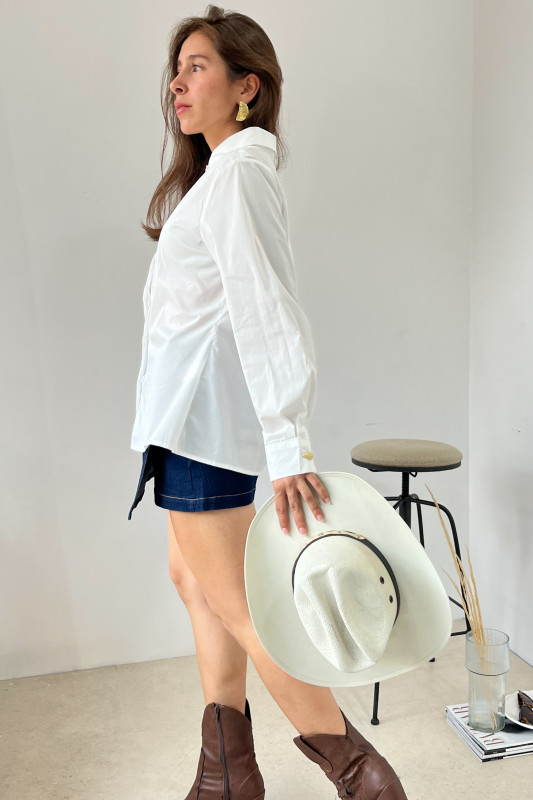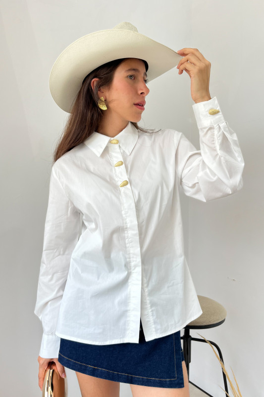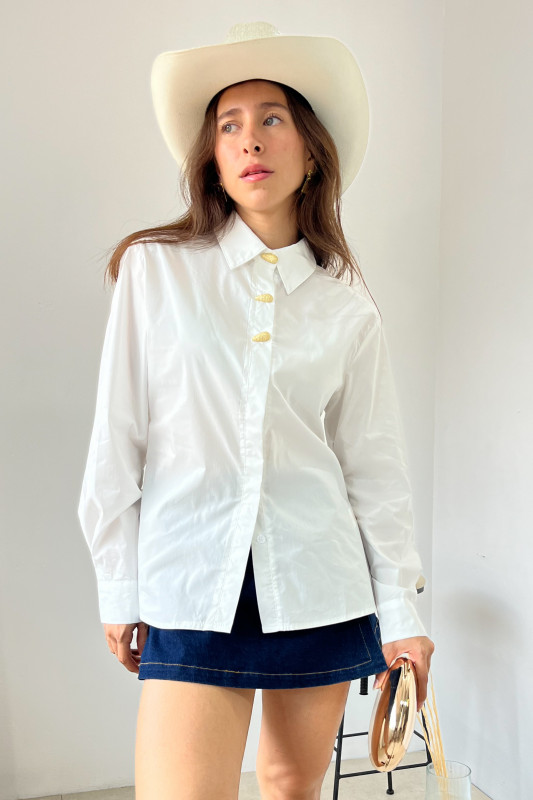 Camisera en popelina de algodón, corte semiajustado con solapa al frente y aplicaciones de botones dorados en cuello y puños.