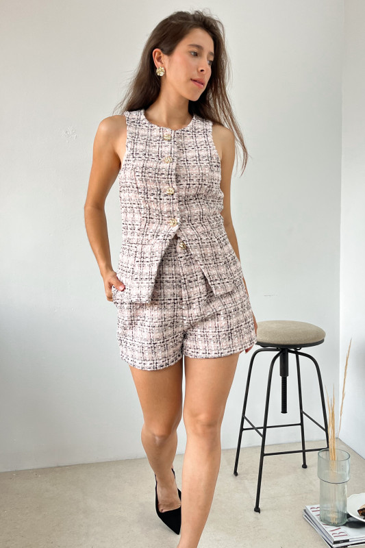 Set en dos piezas en tejido tweed con forro incluido; chaleco corte regular con apertura y botones dorados al frente, short corte regular con bolsas laterales; elástico oculto en espalda y abotonadura al frente.