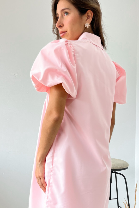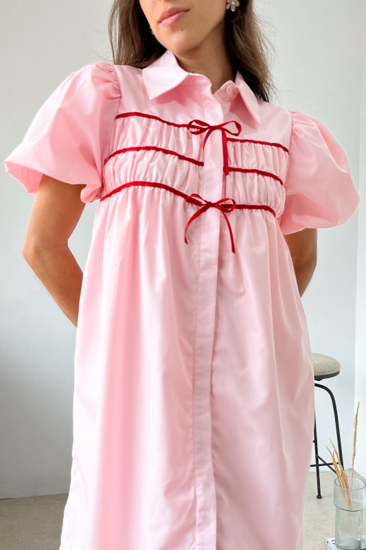 Vestido corto tipo batita con lazos rojos,  botones en busto y mangas amplias abullonadas.