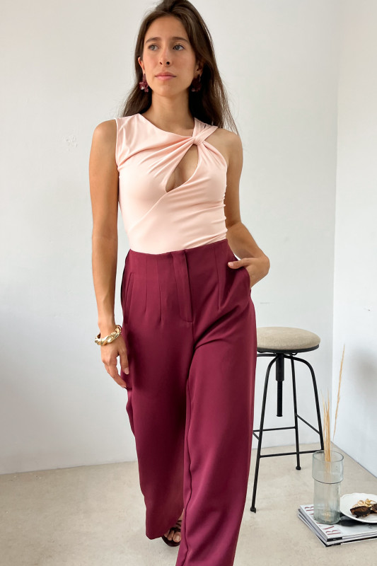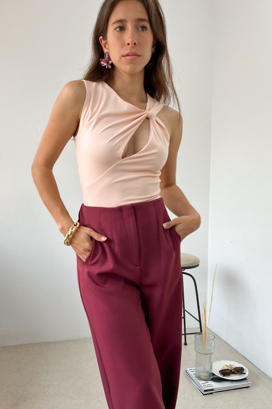 Blusa corte regular en doble tela strech con escote asímetrico y apertura en busto.