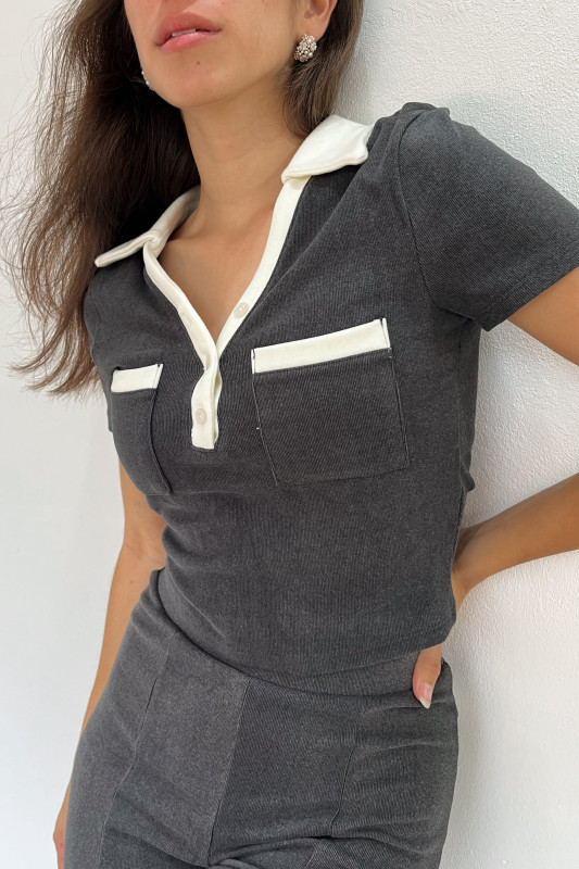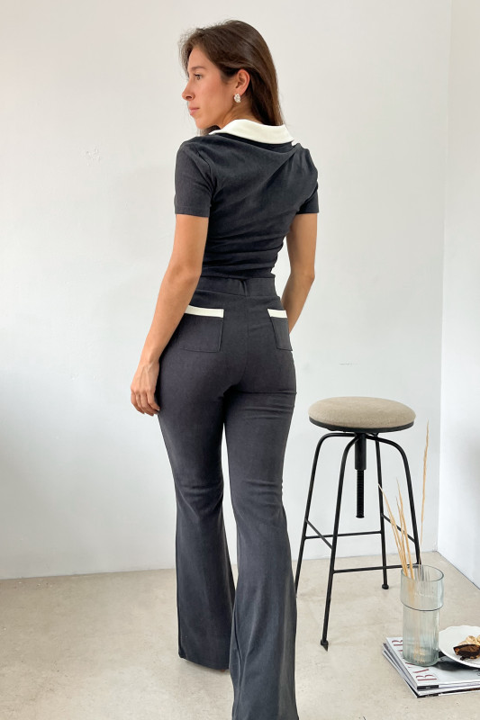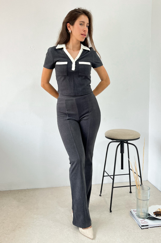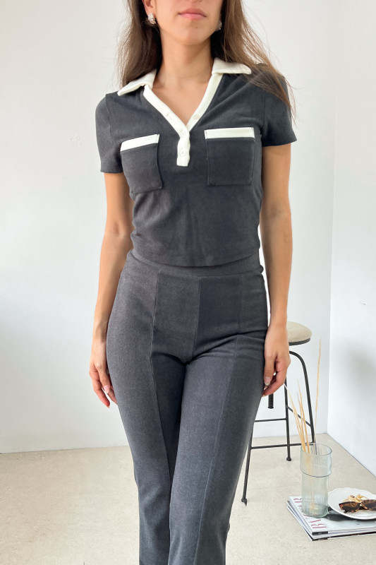 Set en dos piezas de corte semiajustado en tela con acabado afelpado; blusa corta tipo polo con bolsas al frente y detalles de contraste en cuello y bolsas; pantalón tiro alto corte ajustado y piernas tipo campana.