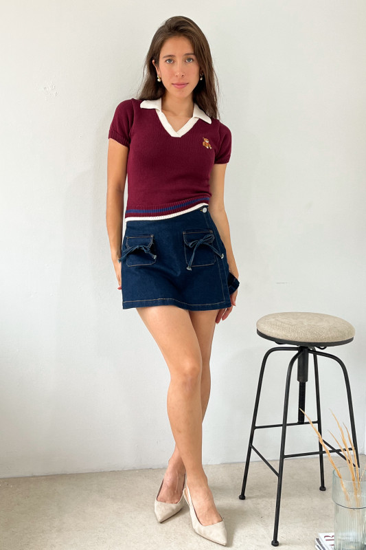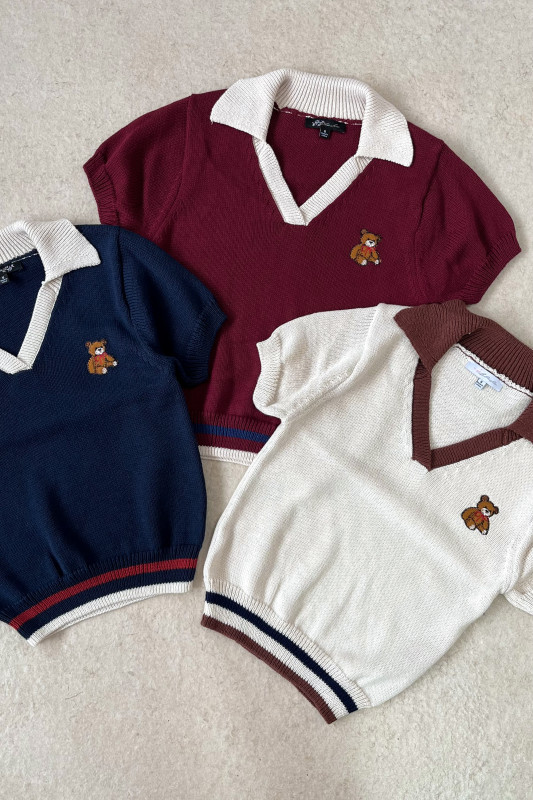 Blusa corta tipo polo en tejido de punto con aplicación de osito bordado, cuello en contraste y cintura con franjas de colores.