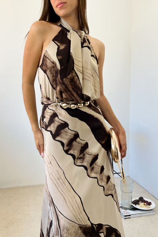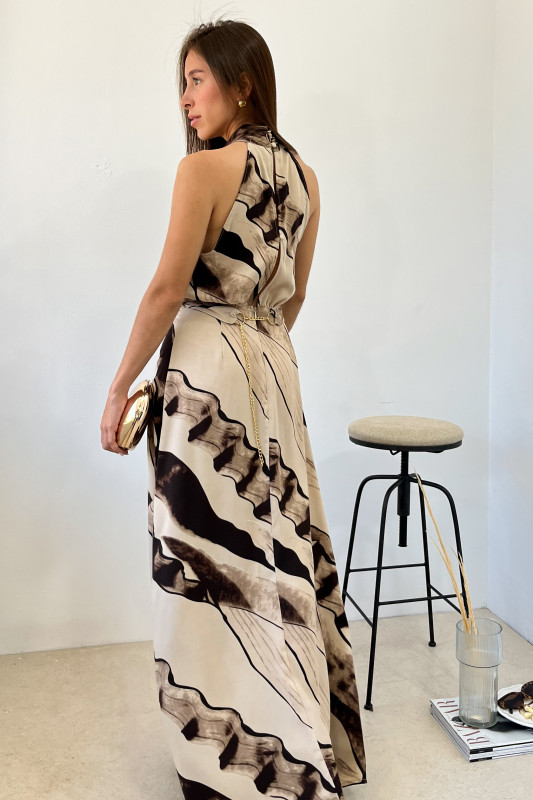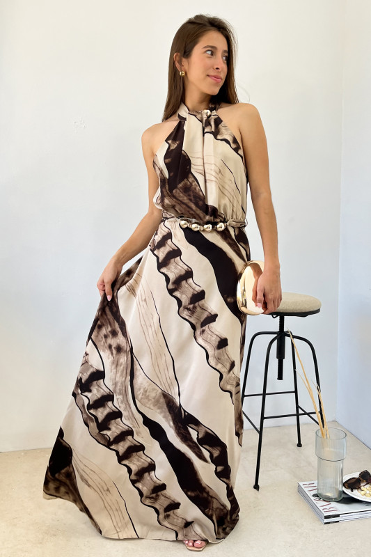 Vestido largo en estmpados variados; cuello haltter con aplicación, espalda con botones, cintura con elástico oculto y cintillo en misma tela con aplicaciones doradas.