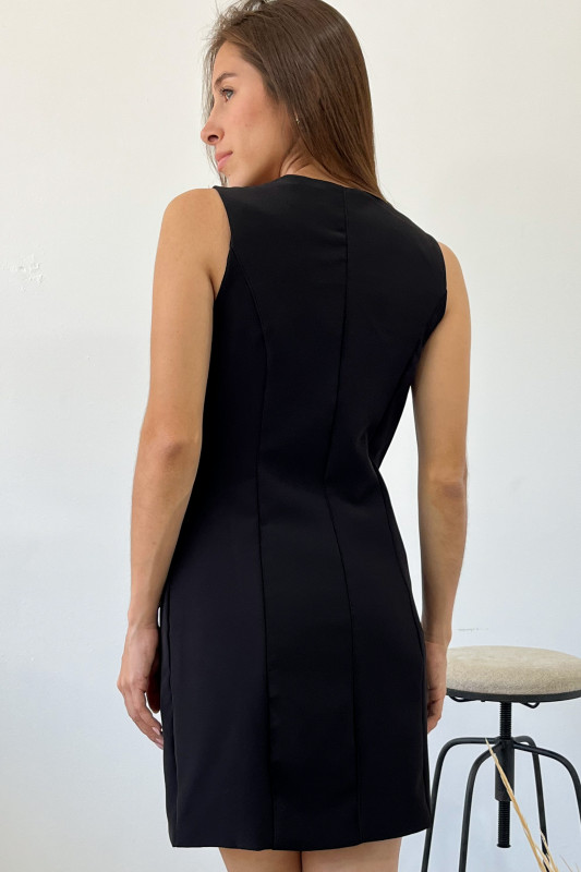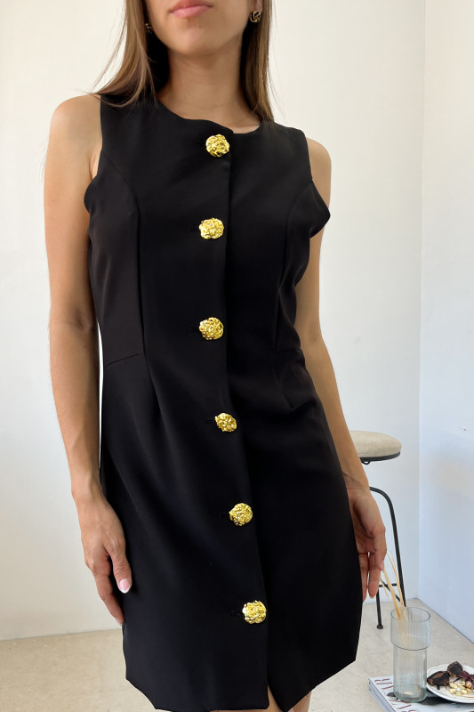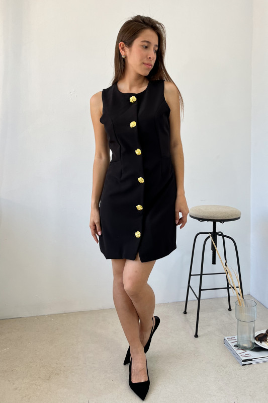 Vestido corto, en corte semiajustado con botones de flores doradas al frente.