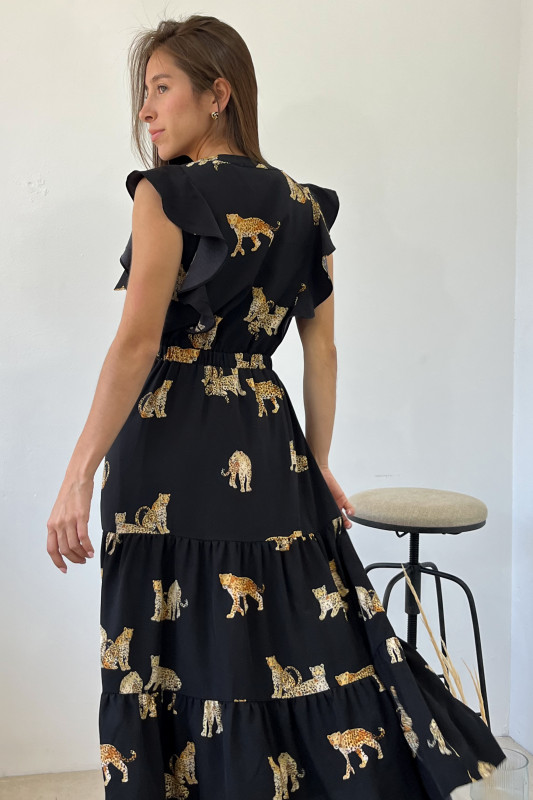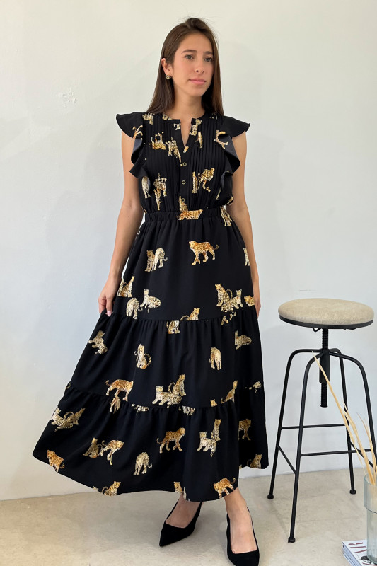 Vestido largo midi con estampados de felinos; parte alta con alforzas al frente y escarolas en mangas; falda amplia con elástico en cintura.