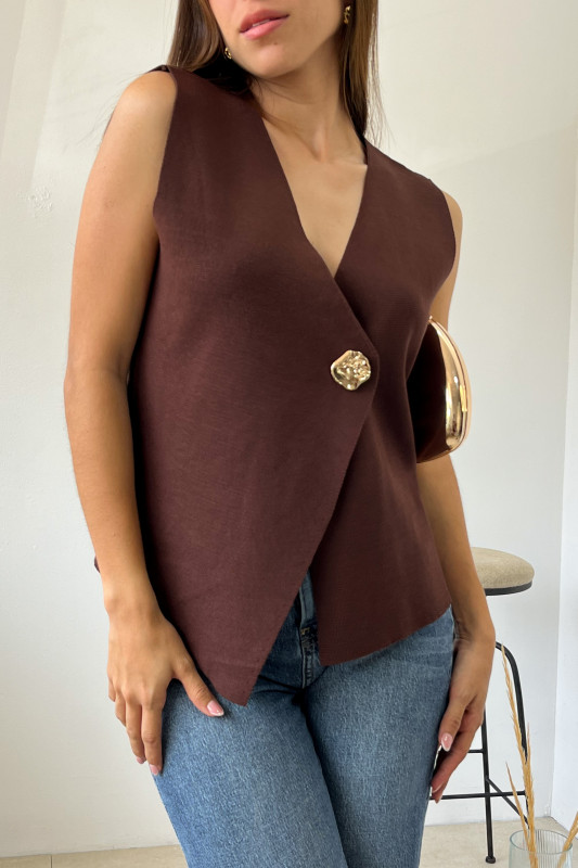 Chaleco en tejido de punto strech,  corte asimetrico con botón dorado al frente.