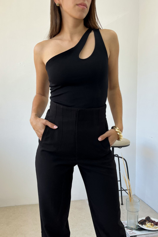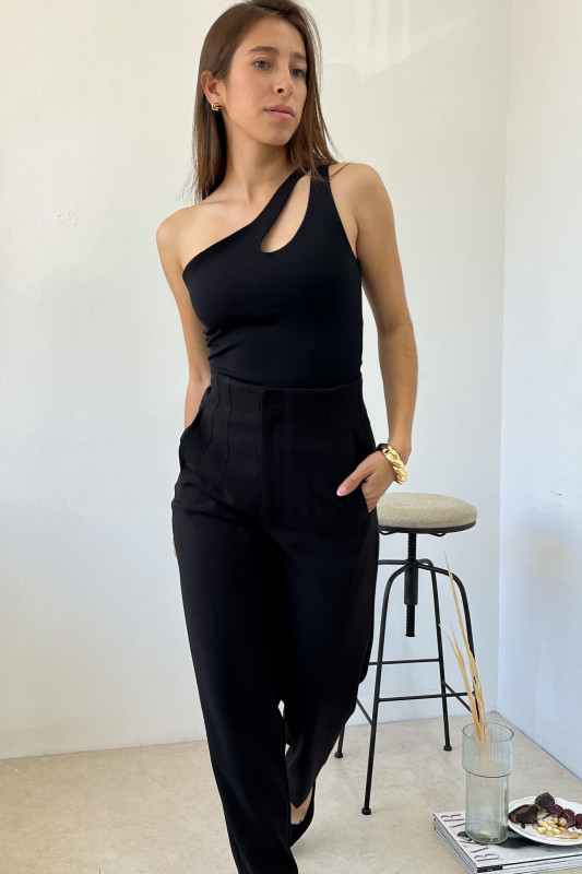 Pantalón tiro alto en corte semiajustado con pinzas al frente y bolsas laterales.