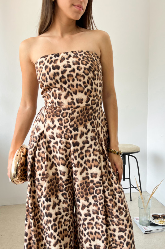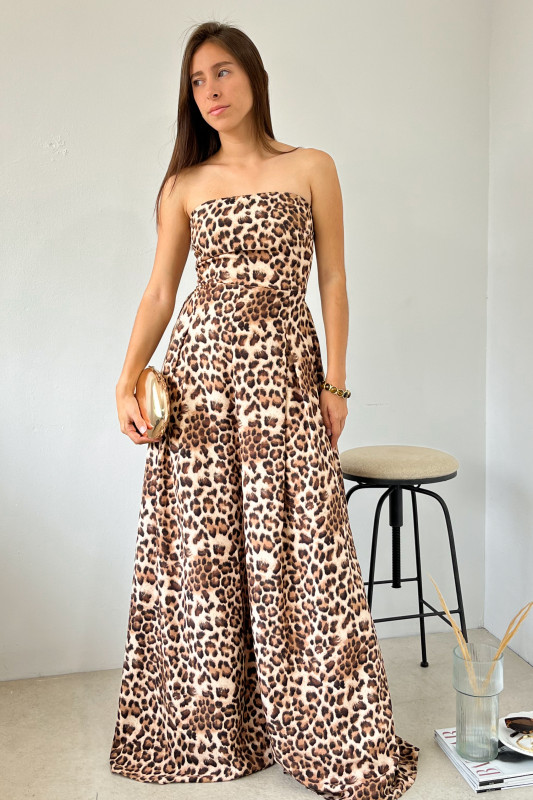 Palazzo strapple en estampado felino; espalda ajustable con lazos en misma tela, elástico en espalda baja y piernas amplias.