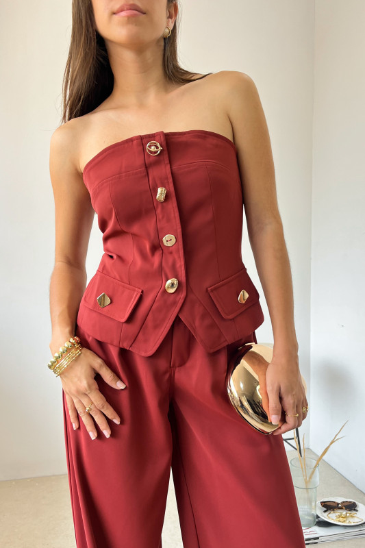 Set en dos piezas, top strapple con aplicaciones de botones dorados y falsas bolsas al frente; maxi pantalón con pretina definida, pinzas al frente y dobladillo ancho.