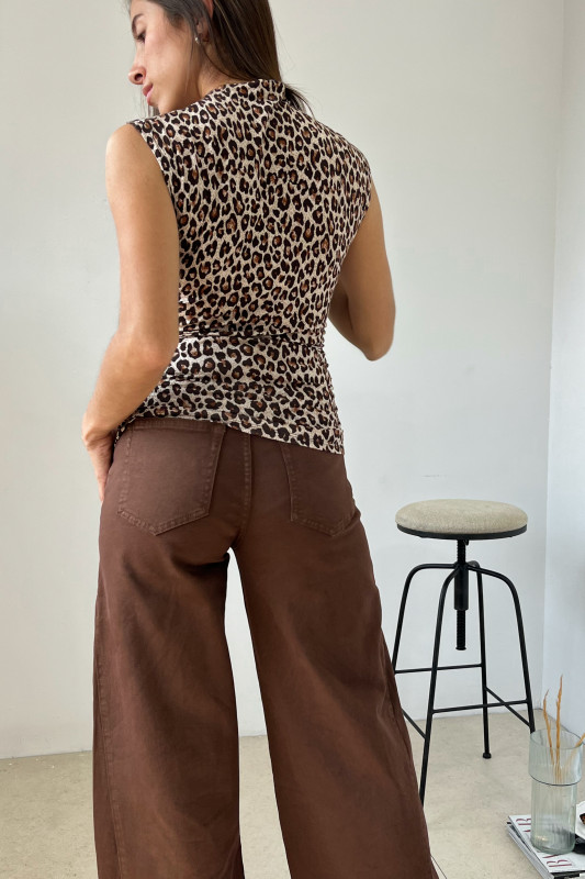 Blusa corte semiajustado en estampado felino, cuello cerrado y elástico drappeado en cintura.