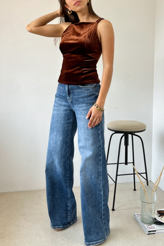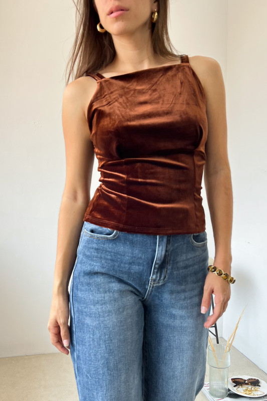 Blusa corta en terciopelo strech, corte semiajustado con escote cuadrado; espalda con aperturas y lazos no ajustables en misma tela.
