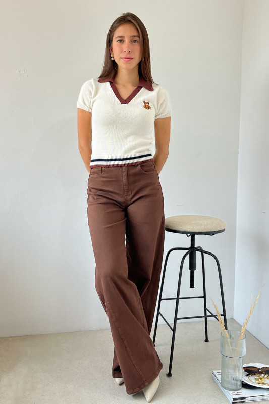Blusa corta tipo polo en tejido de punto con aplicación de osito bordado, cuello en contraste y cintura con franjas de colores.