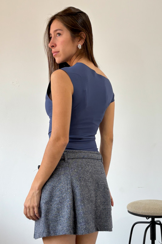 Short falda en corte semiajustado con faldón efecto envolvente con aplicación de broche metálico (opcional) y cierre en espalda.