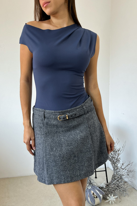 Body en tejido strech sin costuras; escote asimetrico,  efecto drappeado en hombro y cintura